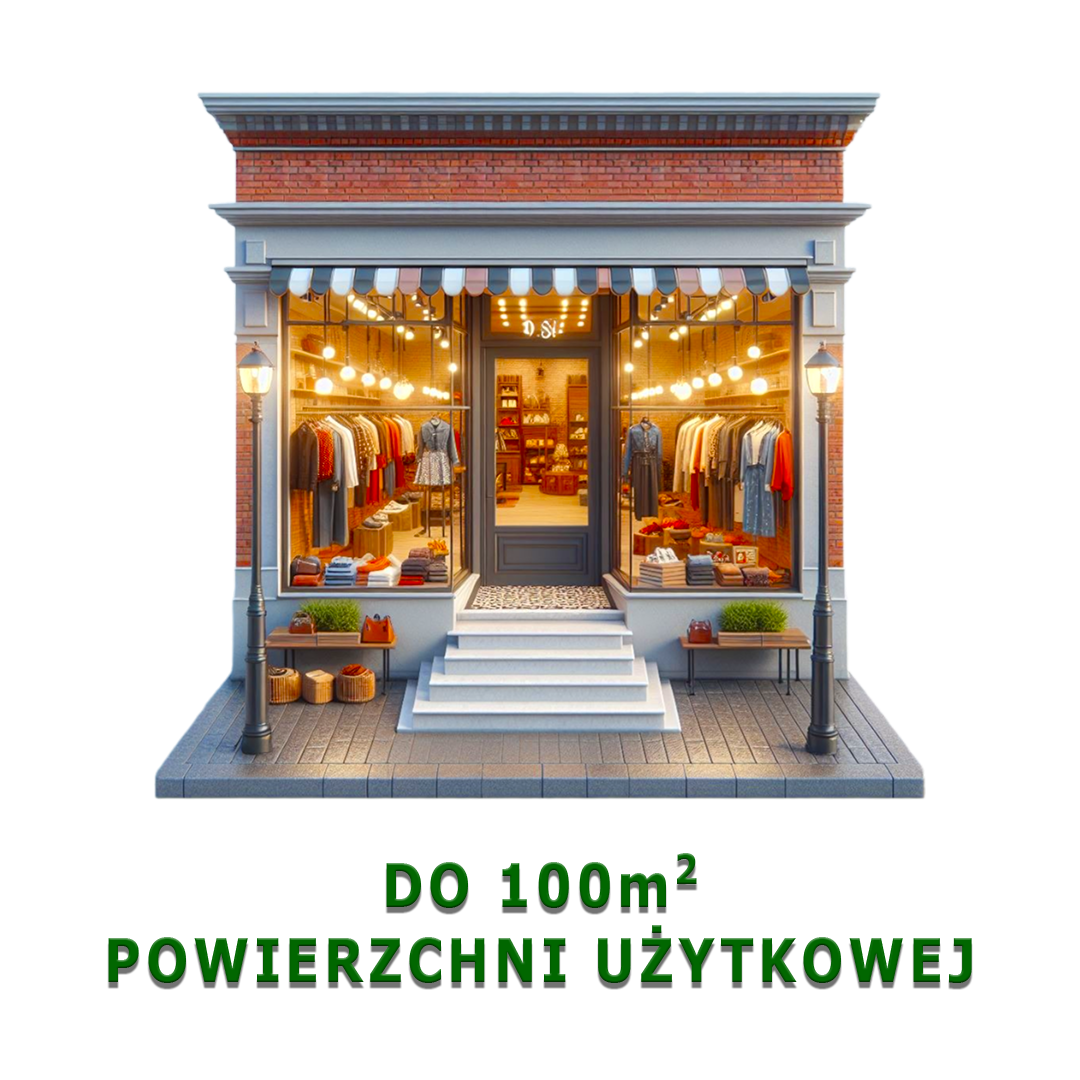 Usługa świadczona online. Cena dotyczy lokalu usługowego (sklepu, kawiarni, banku, kwiaciarni i innych usług), którego powierzchnia użytkowa nie przekracza 100m2.